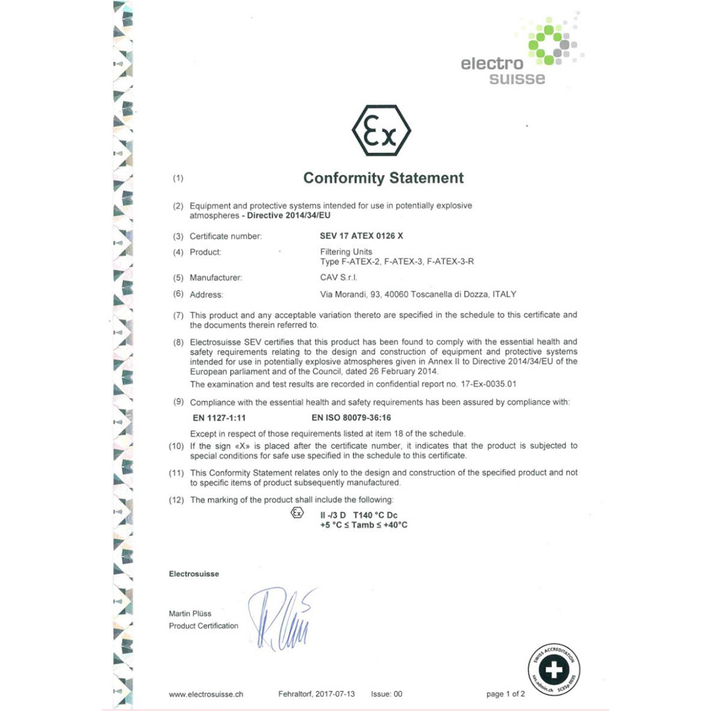 ATEX-zertifizierte Filtereinheit für ZONE II 3D. Zum Anschluss an eine vorhandene Hochdruck-Saugleitung. Struktur aus EDELSTAHL AISI 304; die Filterpatrone wird mittels einer pneumatischen Düse gereinigt, die vom Druckluftbehälter versorgt wird. Die Reinigungsintervalle werden durch einen an einen Delta-P-Sensor angeschlossenen Economizer definiert, um den Reinigungszyklus nur bei Bedarf zu aktivieren. Der vom Trichter gesammelte Staub wird in den darunter liegenden Staubbehälter befördert.