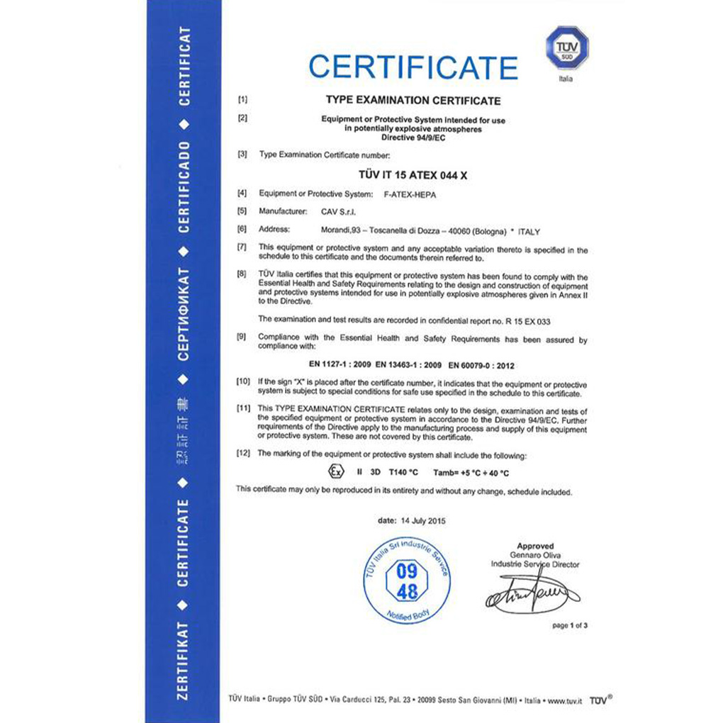 ATEX-zertifizierte Filtereinheit für ZONE II 3D. Zum Anschluss an eine vorhandene Hochdruck-Saugleitung. Struktur aus EDELSTAHL AISI 304; die Filterpatrone wird mittels einer pneumatischen Düse gereinigt, die vom Druckluftbehälter versorgt wird. Die Reinigungsintervalle werden durch einen an einen Delta-P-Sensor angeschlossenen Economizer definiert, um den Reinigungszyklus nur bei Bedarf zu aktivieren. Der vom Trichter gesammelte Staub wird in den darunter liegenden Staubbehälter befördert. Zusätzliches HEPA13-Modul installiert zur Ausfilterung von potentiell krebserregenden Stäuben.